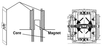 3) Die vier Magnet-Abstandshalter (magnetsupport) an den Ecken zwischen Magnet und Spule einsetzen. |